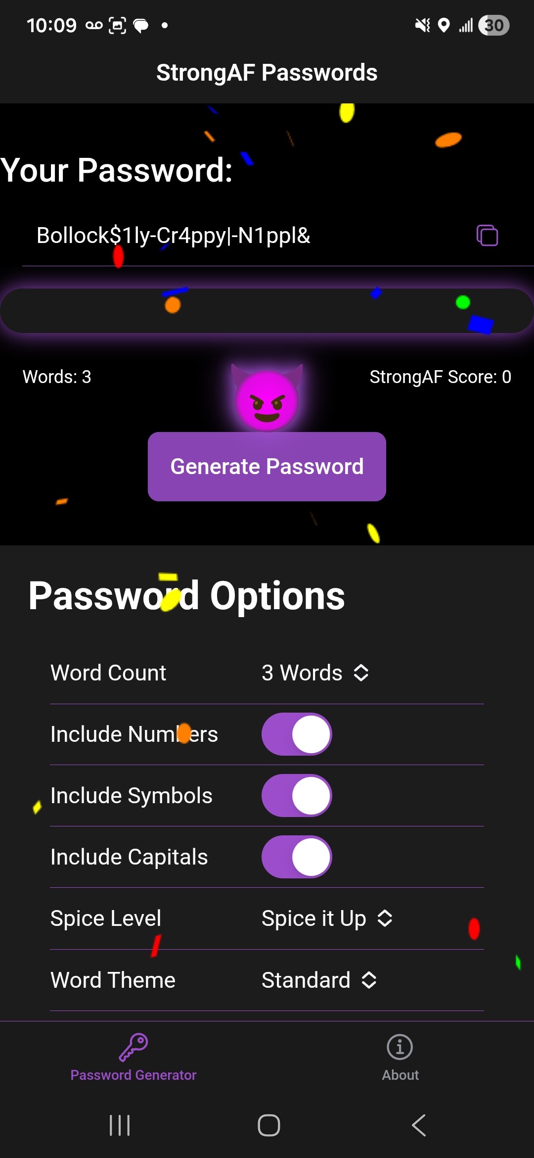 StrongAF Passwords is an Android app that generates high-entropy passphrases using curated dictionaries of funny, suggestive, and downright inappropriate language. The philosophy is simple: generate passwords that are both cryptographically strong AND actually memorable.